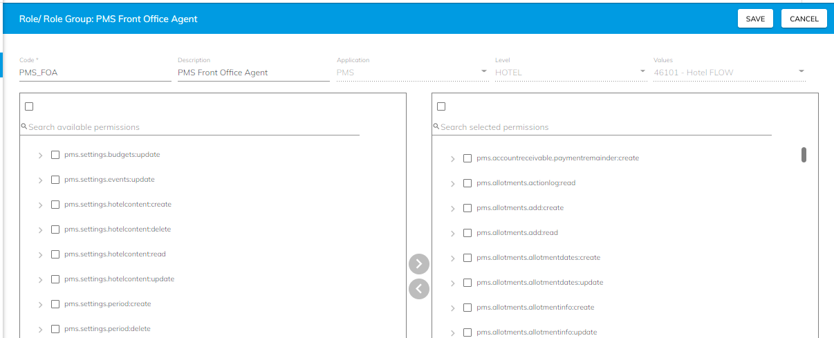 Druk op edit om de rol te openen. In de rol zijn de rechten zichtbaar, waarbij rechts de toegekende rechten zijn en links de nog beschikbare rechten. Bij een eventuele wijziging kan het recht naar de andere kant worden gesleept.