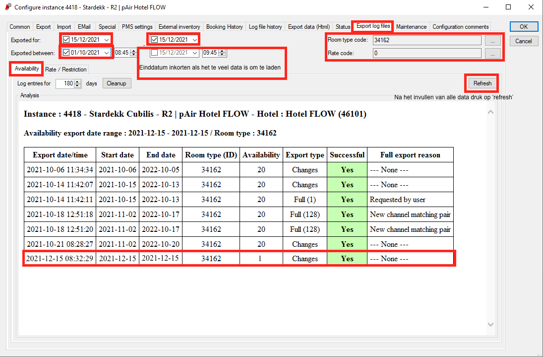 Controleer welke beschikbaarheid we stuurden in IDS vóór het tijdstip van de import van de overboeking: IDS > Export log files > Exported for (vul je de periode in, waarvoor we data moeten sturen) > Exported between (vul je de periode in, wanneer wij de prijs gestuurd wordt) > je kunt eventueel filteren op kamertype en rate code > voor de beschikbaarheid heb je het tabje 'Availability' nodig > refresh (wacht tot de data geladen wordt en druk niet te vaak op dit knopje)