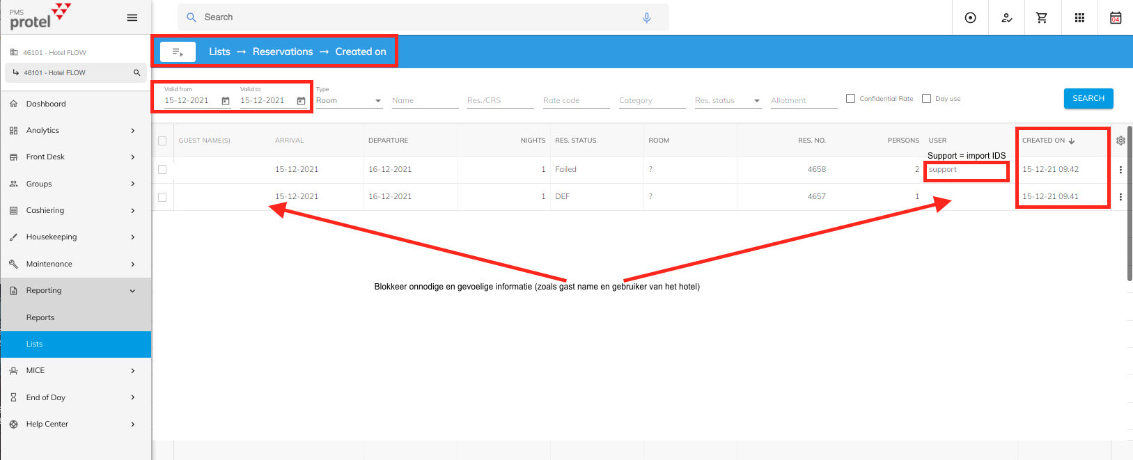 Bekijk de reservering in de IDS De overboeking komt als een failed reservation binnen (met error Error: (44) The category is fully booked). Aan de hand van het bevestiging nummer kun je nakijken waarom het failed binnen is gekomen. Aan de hand van deze check, kun je ook het juiste tarief en kamertype achterhalen, je checkt dit zo: IDS > Booking History > Aankomst/vertrekdatum invullen > PMS reserveringsnummer of CRS nummer invullen > Refresh Je kunt ook filteren op failed of succeeded imports bij de dropdown 'Show all entries'