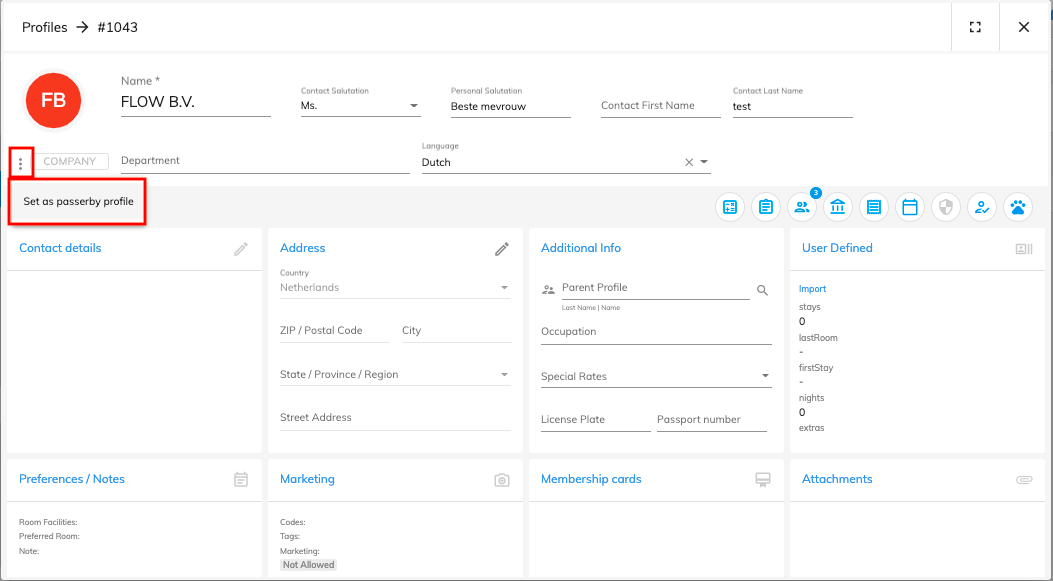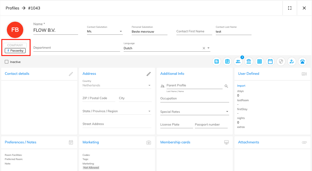 Dit wordt aangepast wanneer je een passerby invoice aanmaakt, vervolgens het profiel opent en de gegevens aanpast. Dit overschrijft dan ook de algemene gegevens, wat er voor zorgt dat vanaf dat moment dat de nieuwe passerby is.