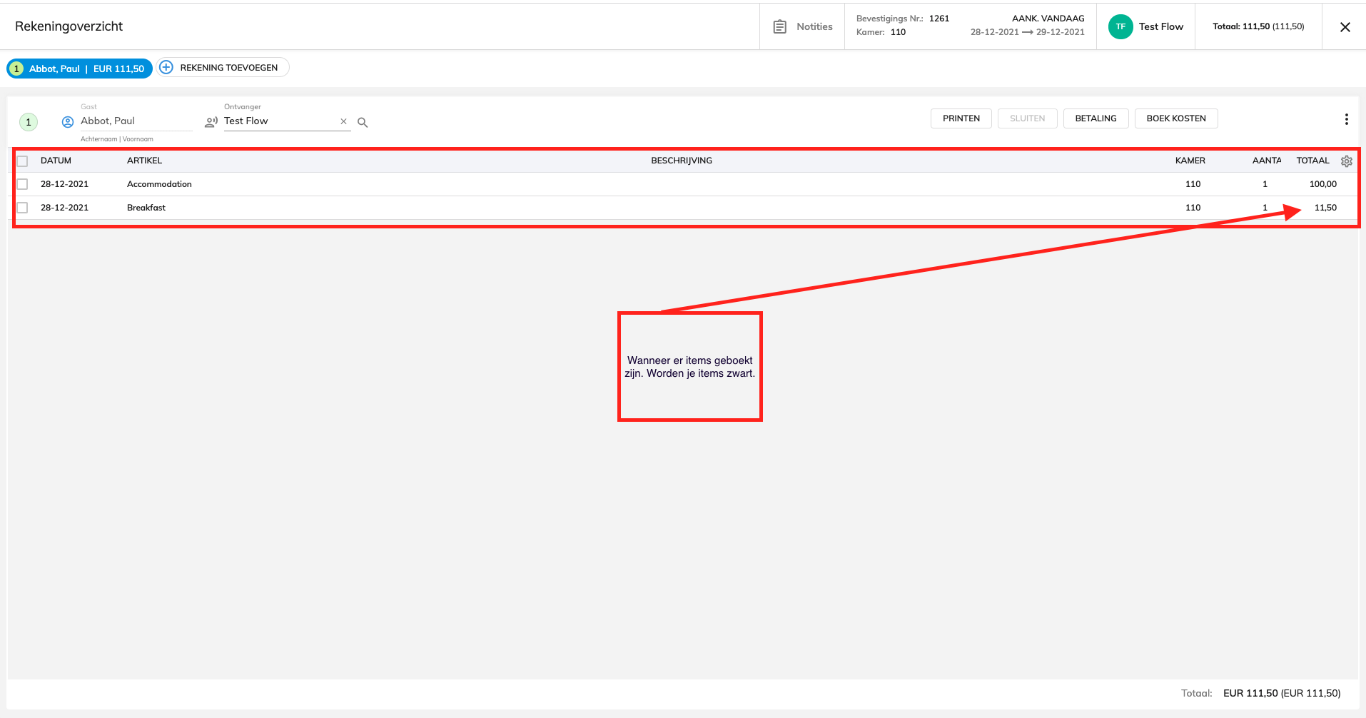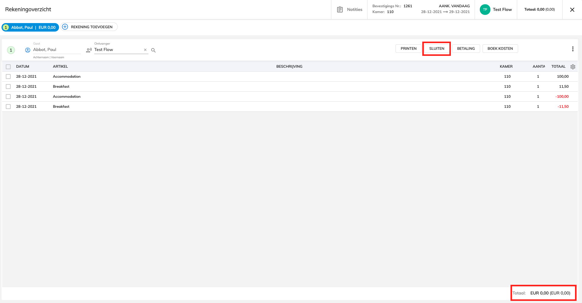 Controleer altijd als er kosten/betalingen zijn geboekt. Hiervoor ga je naar je reservatie - factuur. Wanneer er kosten zijn geboekt wordt dit in het zwart getoond. Check als er een MLOS in deze reservering zit. Zo ja, dan dien je deze stappen ook te volgen #71
