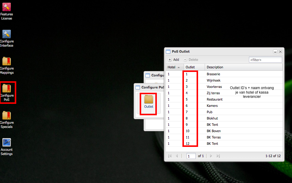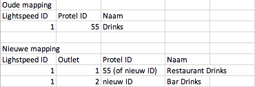 Let hierbij wel op dat wanneer je het originele artikel wijzigt (POS Drinks) naar bijvoorbeeld Restaurant Drinks, dat in de rapporten de omzet van POS Drinks getoond wordt als Restaurant drinks. Als je dat niet wil moet je nieuwe artikelen maken voor alle omzetgroepen. Als dat juist de bedoeling is, is het geen probleem om de naam te wijzigen van POS drinks naar POS Restaurant Drinks en vervolgens een nieuwe aan te maken voor BAR. Stap 3; laat ons weten wat de ID's van de outlets zijn.